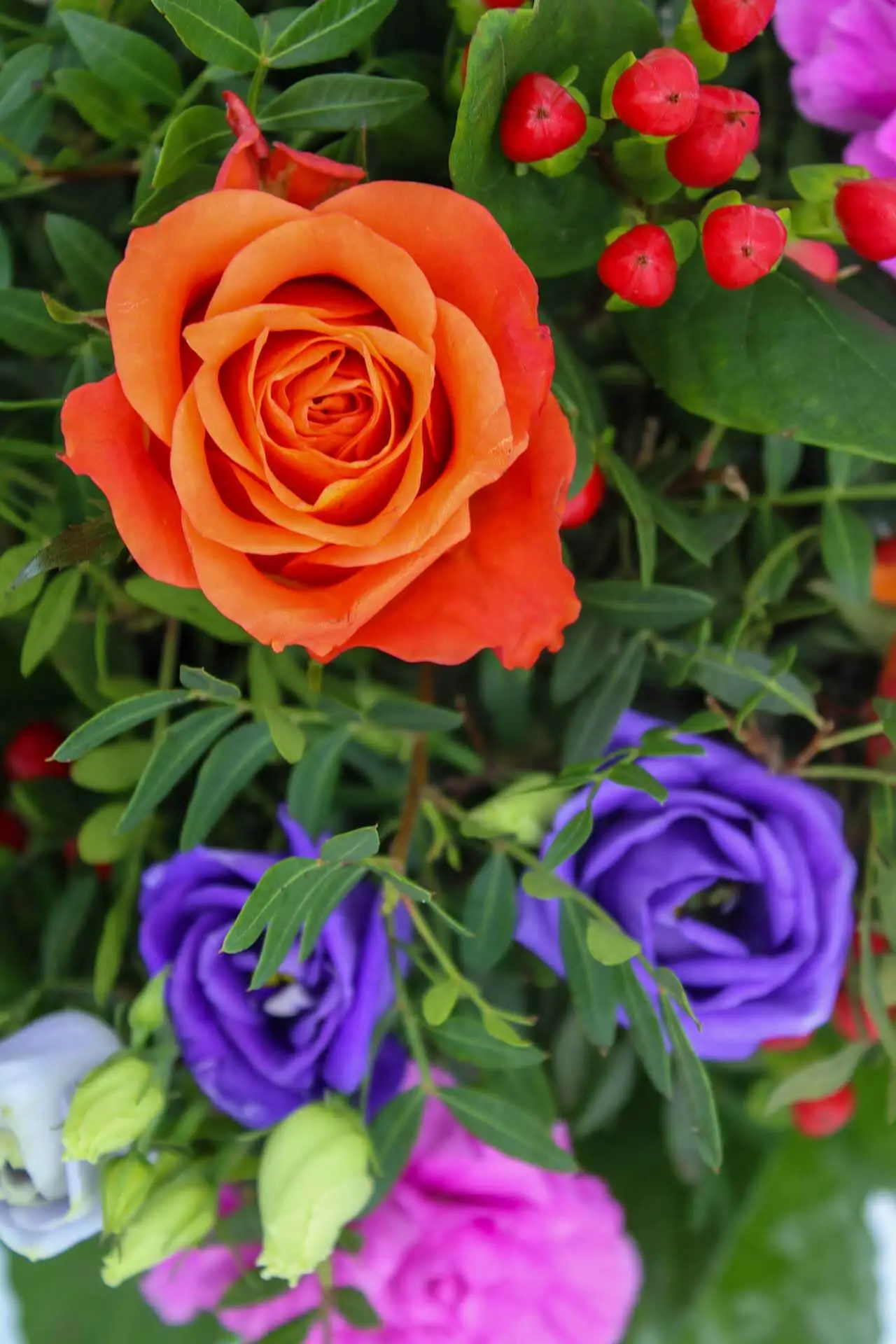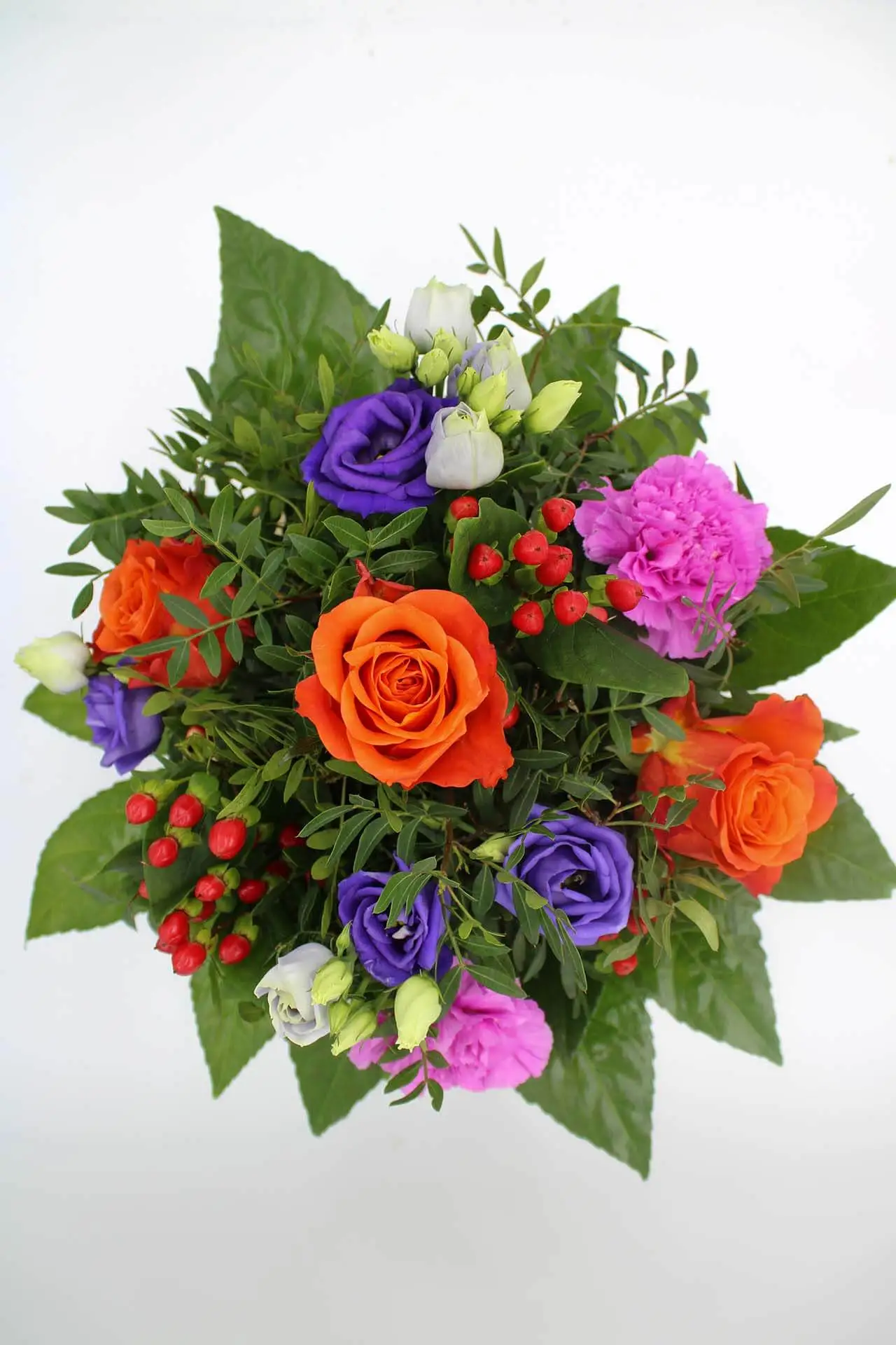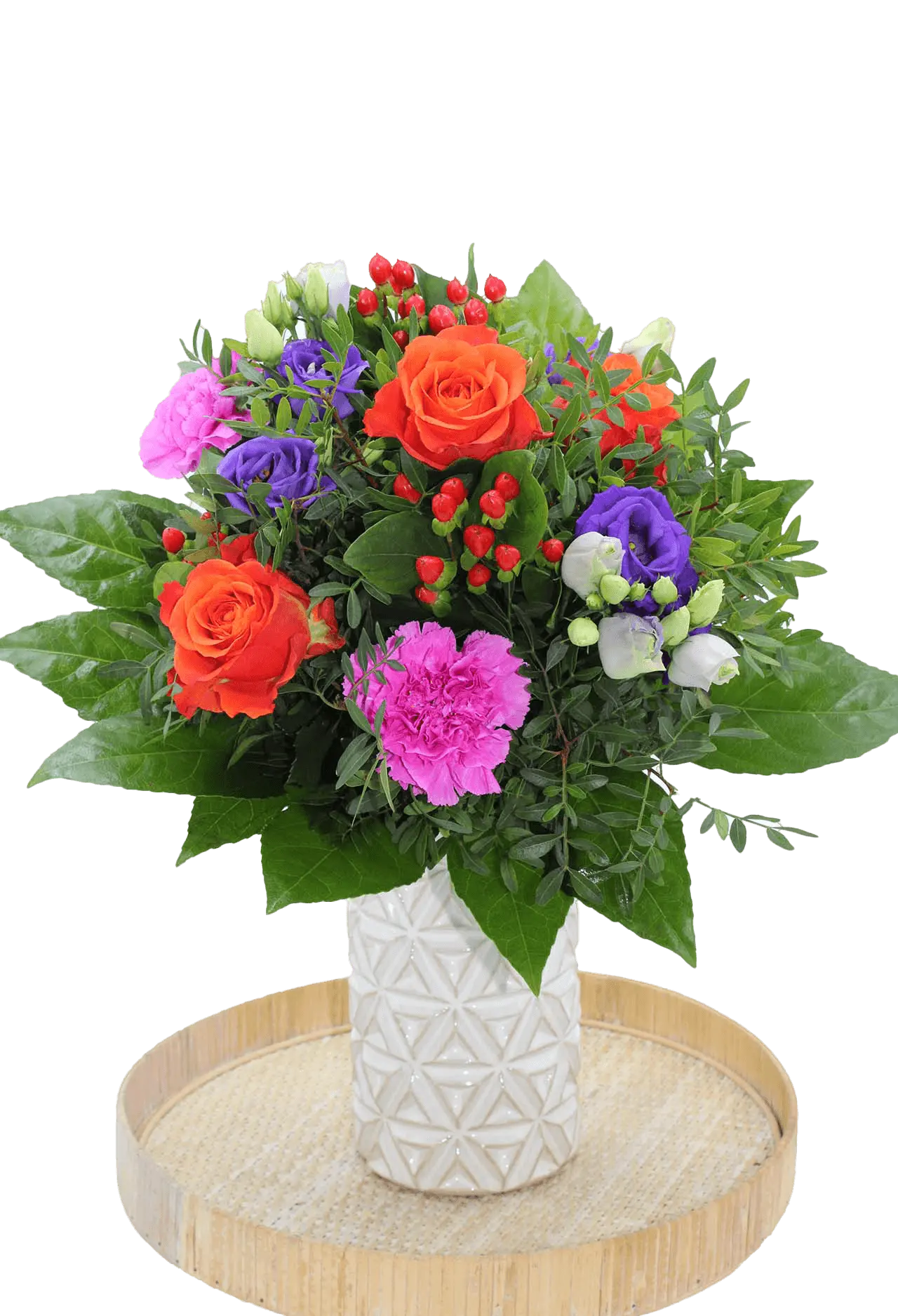 Glückwünsche versenden leicht gemacht mit unserem Strauß „Glückwünsche“. Ein stimmungsvoller Mix aus eleganten Rosen, leuchtendem Hypericum, klassischen Nelken und feinen Eustoma, alle gekonnt ergänzt durch frisches grünes Beiwerk. Wenn du herzliche Glückwünsche als Blumen verschicken möchtest, ist dieser Strauß die perfekte Wahl.