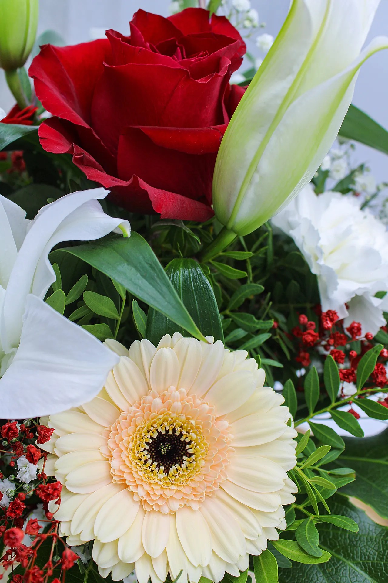 Ein wunderschöner Blumenstrauß aus einer Rose, Lilien, Nelken, Germini, zweierlei Schleierkraut und grünem Beiwerk.
